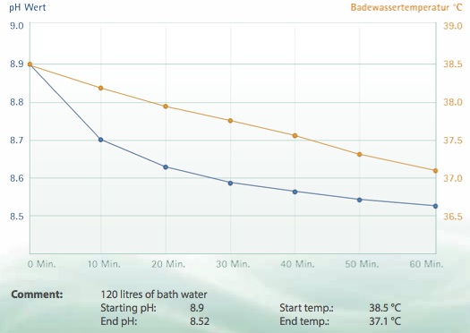 Le tableau ci-contre montre l'efficacité de désacidification avec Rayosole® plus pendant 60 minutes. La valeur du pH de l' eau baisse de 8,9 à 8,52, la preuve que les acides migrent depuis le corps vers l'eau. Comme l'indication du pH est un logarithme, ces valeurs sont des preuves claires d'une désacidification puissante.