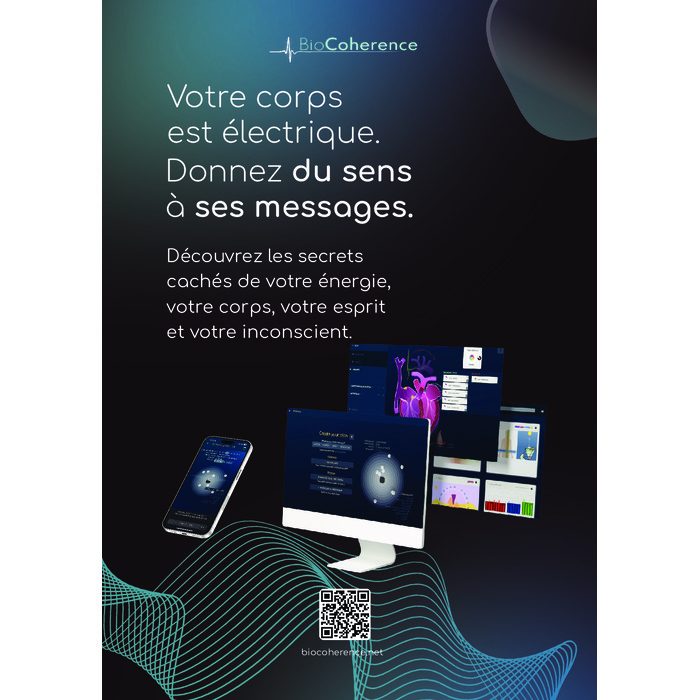 BioCoherence est un nouveau système révolutionnaire d'analyse d'électrocardiogramme 100% reproductible, qui calcule plus de 1400 biomarqueurs et construit des plans d'équilibrage sous forme de Boost harmoniques (fréquences audio) et Guides personnels (méditations guidées).